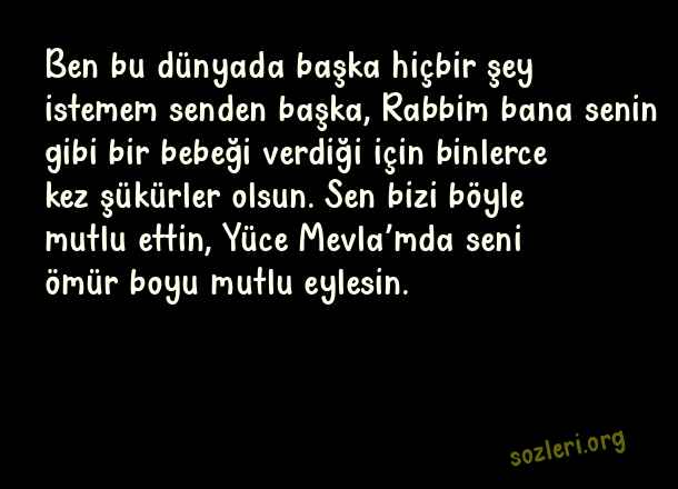 Ben bu dünyada başka hiçbir şey istemem senden başka, Rabbim bana senin gibi bir bebeği verdiği için binlerce kez şükürler olsun. Sen bizi böyle mutlu ettin, Yüce Mevla’mda seni ömür boyu mutlu eylesin. ( 1 Yaş Doğum Günü )