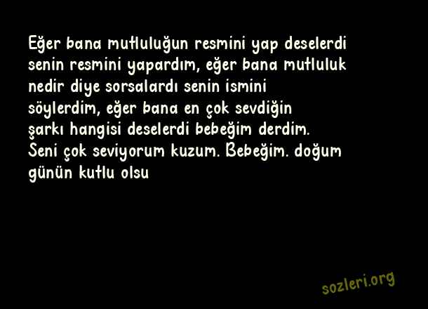 Eğer bana mutluluğun resmini yap deselerdi senin resmini yapardım, eğer bana mutluluk nedir diye sorsalardı senin ismini söylerdim, eğer bana en çok sevdiğin şarkı hangisi deselerdi bebeğim derdim. Seni çok seviyorum kuzum. Bebeğim. doğum günün kutlu olsu ( 1 Yaş Doğum Günü )
