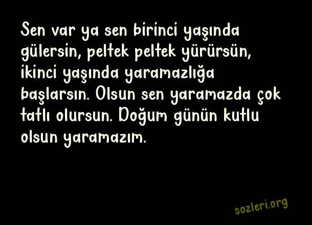 Sen var ya sen birinci yaşında gülersin, peltek peltek yürürsün, ikinci yaşında yaramazlığa başlarsın. Olsun sen yaramazda çok tatlı olursun. Doğum günün kutlu olsun yaramazım. ( 1 Yaş Doğum Günü )