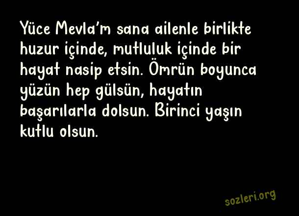 Yüce Mevla’m sana ailenle birlikte huzur içinde, mutluluk içinde bir hayat nasip etsin. Ömrün boyunca yüzün hep gülsün, hayatın başarılarla dolsun. Birinci yaşın kutlu olsun. ( 1 Yaş Doğum Günü )