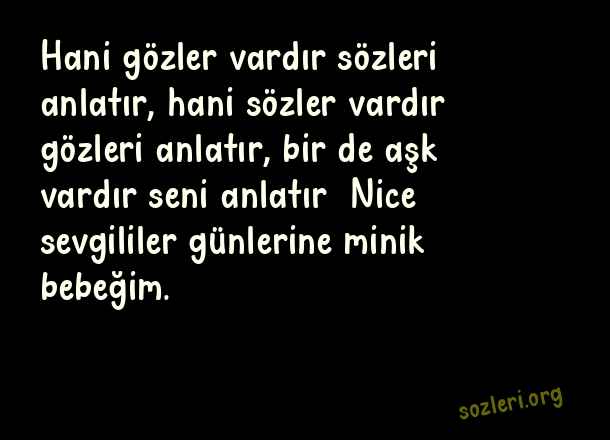 Hani gözler vardır sözleri anlatır, hani sözler vardır gözleri anlatır, bir de aşk vardır seni anlatır… Nice sevgililer günlerine minik bebeğim. ( 14 Şubat Sevgililer Günü İle İlgili Mesajlar )