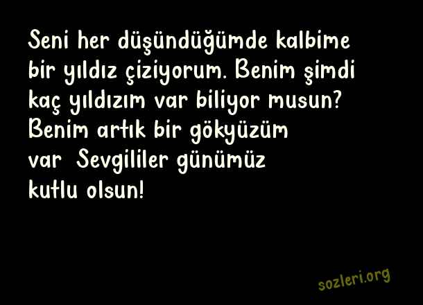 Seni her düşündüğümde kalbime bir yıldız çiziyorum. Benim şimdi kaç yıldızım var biliyor musun? Benim artık bir gökyüzüm var… Sevgililer günümüz kutlu olsun! ( 14 Şubat Sevgililer Günü İle İlgili Mesajlar )