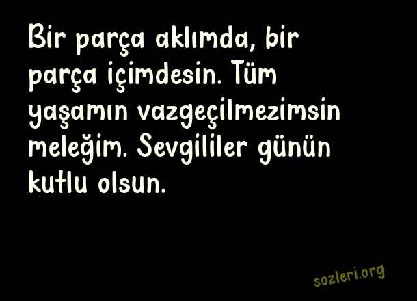 Bir parça aklımda, bir parça içimdesin. Tüm yaşamın vazgeçilmezimsin meleğim. Sevgililer günün kutlu olsun. ( 14 Şubat Sevgililer Günü )