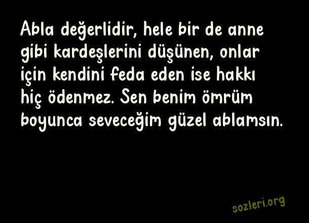 Abla değerlidir, hele bir de anne gibi kardeşlerini düşünen, onlar için kendini feda eden ise hakkı hiç ödenmez. Sen benim ömrüm boyunca seveceğim güzel ablamsın. ( Abla )
