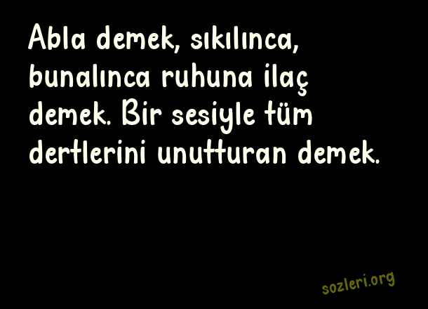 Abla demek, sıkılınca, bunalınca ruhuna ilaç demek. Bir sesiyle tüm dertlerini unutturan demek. ( Abla )