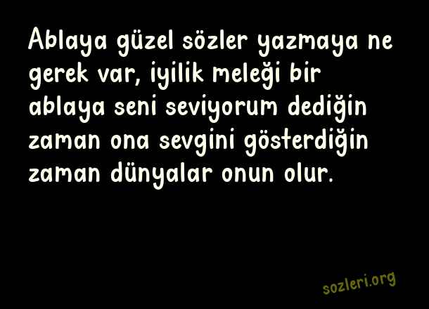 Ablaya güzel sözler yazmaya ne gerek var, iyilik meleği bir ablaya seni seviyorum dediğin zaman ona sevgini gösterdiğin zaman dünyalar onun olur. ( Abla )