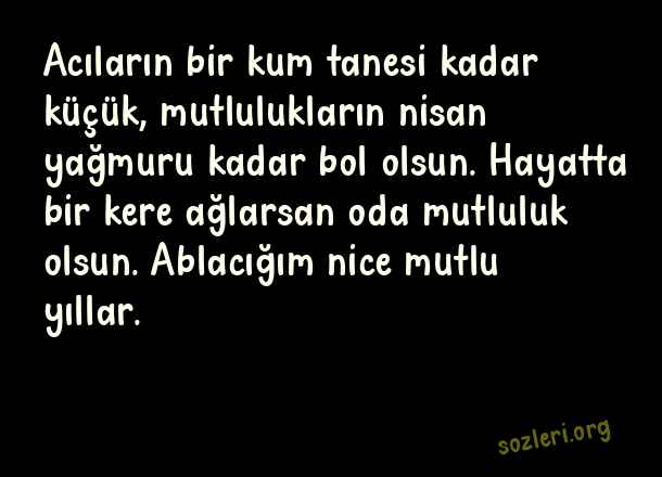 Acıların bir kum tanesi kadar küçük, mutlulukların nisan yağmuru kadar bol olsun. Hayatta bir kere ağlarsan oda mutluluk olsun. Ablacığım nice mutlu yıllar. ( Ablaya Doğum Günü )