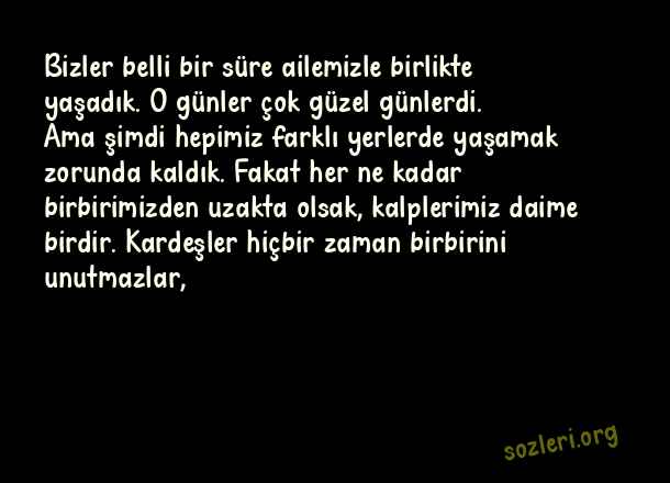 Bizler belli bir süre ailemizle birlikte yaşadık. O günler çok güzel günlerdi. Ama şimdi hepimiz farklı yerlerde yaşamak zorunda kaldık. Fakat her ne kadar birbirimizden uzakta olsak, kalplerimiz daime birdir. Kardeşler hiçbir zaman birbirini unutmazlar, ( Abla )
