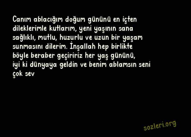 Canım ablacığım doğum gününü en içten dileklerimle kutlarım, yeni yaşının sana sağlıklı, mutlu, huzurlu ve uzun bir yaşam sunmasını dilerim. İnşallah hep birlikte böyle beraber geçiririz her yaş gününü, iyi ki dünyaya geldin ve benim ablamsın seni çok sev ( Ablaya Doğum Günü )