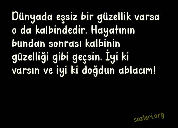 Dünyada eşsiz bir güzellik varsa o da kalbindedir. Hayatının bundan sonrası kalbinin güzelliği gibi geçsin. İyi ki varsın ve iyi ki doğdun ablacım! ( Ablaya Doğum Günü )