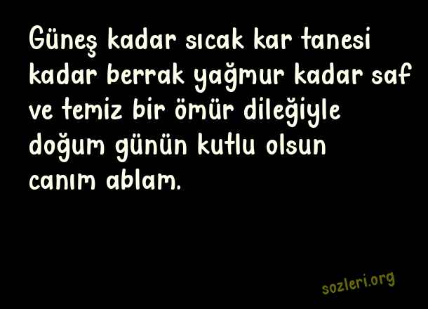 Güneş kadar sıcak kar tanesi kadar berrak yağmur kadar saf ve temiz bir ömür dileğiyle doğum günün kutlu olsun canım ablam. ( Ablaya Doğum Günü )
