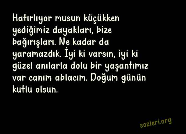 Hatırlıyor musun küçükken yediğimiz dayakları, bize bağırışları. Ne kadar da yaramazdık. İyi ki varsın, iyi ki güzel anılarla dolu bir yaşantımız var canım ablacım. Doğum günün kutlu olsun. ( Ablaya Doğum Günü )
