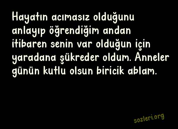 Hayatın acımasız olduğunu anlayıp öğrendiğim andan itibaren senin var olduğun için yaradana şükreder oldum. Anneler günün kutlu olsun biricik ablam. ( Ablaya Anneler Günü )