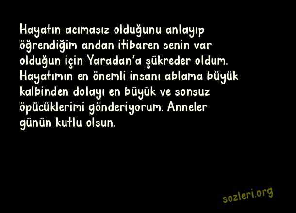 Hayatın acımasız olduğunu anlayıp öğrendiğim andan itibaren senin var olduğun için Yaradan’a şükreder oldum. Hayatımın en önemli insanı ablama büyük kalbinden dolayı en büyük ve sonsuz öpücüklerimi gönderiyorum. Anneler günün kutlu olsun. ( Ablaya Anneler Günü )