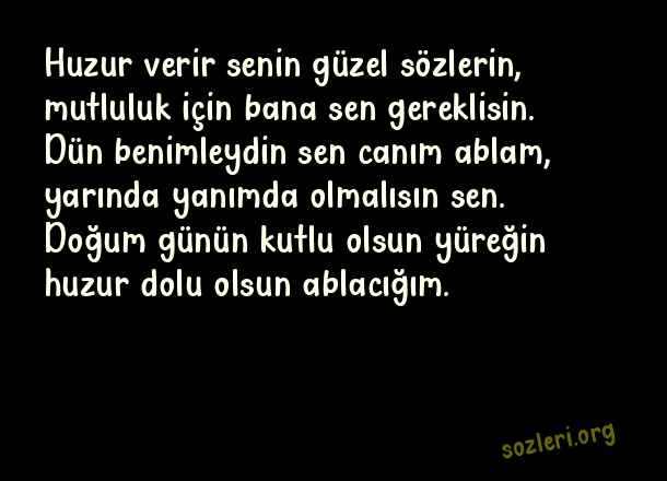 Huzur verir senin güzel sözlerin, mutluluk için bana sen gereklisin. Dün benimleydin sen canım ablam, yarında yanımda olmalısın sen. Doğum günün kutlu olsun yüreğin huzur dolu olsun ablacığım. ( Ablaya Doğum Günü )