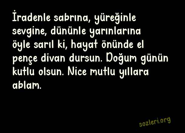 İradenle sabrına, yüreğinle sevgine, dününle yarınlarına öyle sarıl ki, hayat önünde el pençe divan dursun. Doğum günün kutlu olsun. Nice mutlu yıllara ablam. ( Ablaya Doğum Günü )