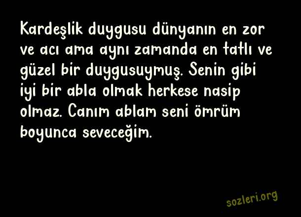 Kardeşlik duygusu dünyanın en zor ve acı ama aynı zamanda en tatlı ve güzel bir duygusuymuş. Senin gibi iyi bir abla olmak herkese nasip olmaz. Canım ablam seni ömrüm boyunca seveceğim. ( Abla )