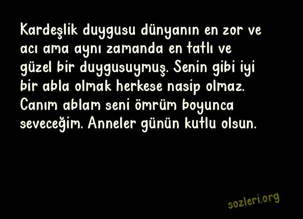 Kardeşlik duygusu dünyanın en zor ve acı ama aynı zamanda en tatlı ve güzel bir duygusuymuş. Senin gibi iyi bir abla olmak herkese nasip olmaz. Canım ablam seni ömrüm boyunca seveceğim. Anneler günün kutlu olsun. ( Ablaya Anneler Günü )
