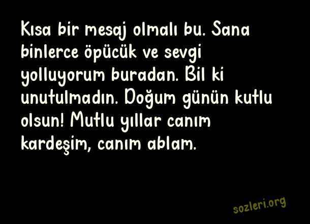Kısa bir mesaj olmalı bu. Sana binlerce öpücük ve sevgi yolluyorum buradan. Bil ki unutulmadın. Doğum günün kutlu olsun! Mutlu yıllar canım kardeşim, canım ablam. ( Ablaya Doğum Günü )