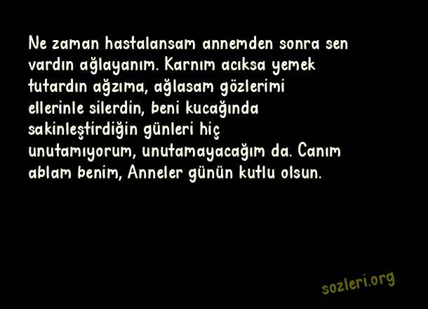 Ne zaman hastalansam annemden sonra sen vardın ağlayanım. Karnım acıksa yemek tutardın ağzıma, ağlasam gözlerimi ellerinle silerdin, beni kucağında sakinleştirdiğin günleri hiç unutamıyorum, unutamayacağım da. Canım ablam benim, Anneler günün kutlu olsun. ( Ablaya Anneler Günü )