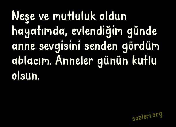 Neşe ve mutluluk oldun hayatımda, evlendiğim günde anne sevgisini senden gördüm ablacım. Anneler günün kutlu olsun. ( Ablaya Anneler Günü )