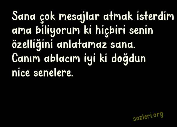 Sana çok mesajlar atmak isterdim ama biliyorum ki hiçbiri senin özelliğini anlatamaz sana. Canım ablacım iyi ki doğdun nice senelere. ( Ablaya Doğum Günü )