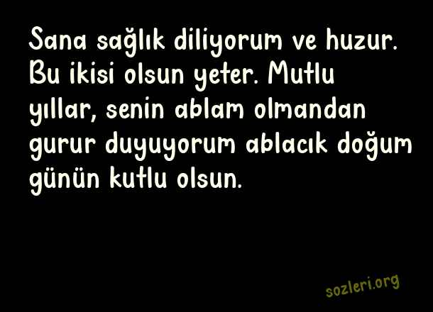 Sana sağlık diliyorum ve huzur. Bu ikisi olsun yeter. Mutlu yıllar, senin ablam olmandan gurur duyuyorum ablacık doğum günün kutlu olsun. ( Ablaya Doğum Günü )