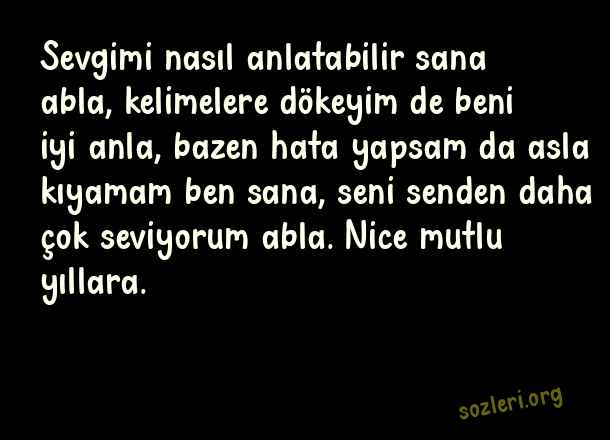 Sevgimi nasıl anlatabilir sana abla, kelimelere dökeyim de beni iyi anla, bazen hata yapsam da asla kıyamam ben sana, seni senden daha çok seviyorum abla. Nice mutlu yıllara. ( Ablaya Doğum Günü )