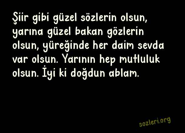 Şiir gibi güzel sözlerin olsun, yarına güzel bakan gözlerin olsun, yüreğinde her daim sevda var olsun. Yarının hep mutluluk olsun. İyi ki doğdun ablam. ( Ablaya Doğum Günü )