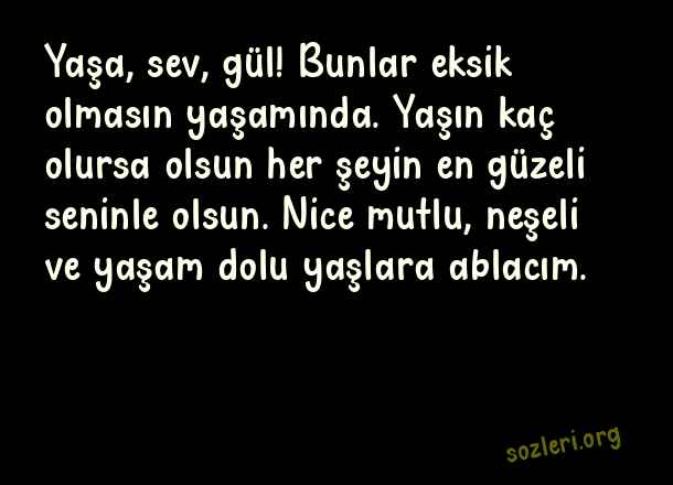 Yaşa, sev, gül! Bunlar eksik olmasın yaşamında. Yaşın kaç olursa olsun her şeyin en güzeli seninle olsun. Nice mutlu, neşeli ve yaşam dolu yaşlara ablacım. ( Ablaya Doğum Günü )