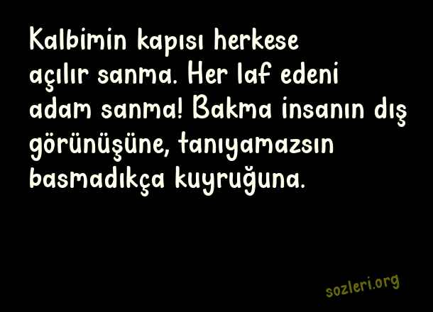 Kalbimin kapısı herkese açılır sanma. Her laf edeni adam sanma! Bakma insanın dış görünüşüne, tanıyamazsın basmadıkça kuyruğuna. ( Adam Olmayanlara Ağır Sözler )