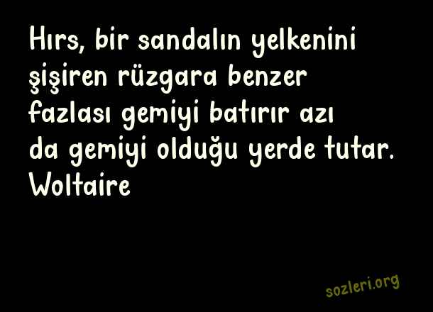 Hırs, bir sandalın yelkenini şişiren rüzgara benzer fazlası gemiyi batırır azı da gemiyi olduğu yerde tutar. Woltaire ( Alçak Gönüllülük )