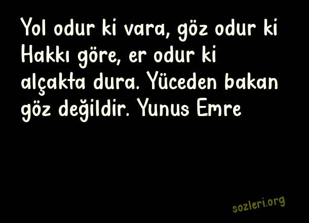 Yol odur ki vara, göz odur ki Hakkı göre, er odur ki alçakta dura. Yüceden bakan göz değildir. Yunus Emre ( Alçak Gönüllülük )