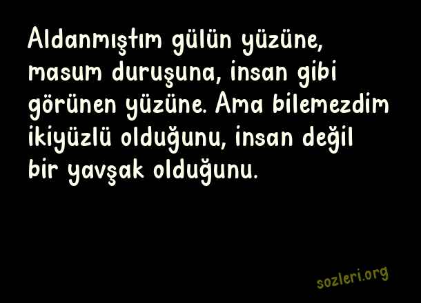 Aldanmıştım gülün yüzüne, masum duruşuna, insan gibi görünen yüzüne. Ama bilemezdim ikiyüzlü olduğunu, insan değil bir yavşak olduğunu. ( Aldatan Sevgiliye Kapak Sözler )