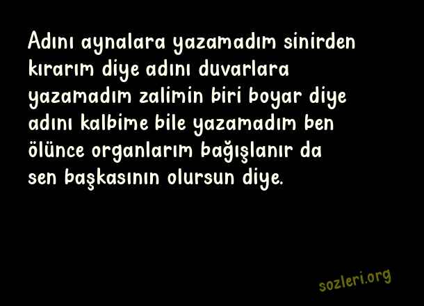 Adını aynalara yazamadım sinirden kırarım diye adını duvarlara yazamadım zalimin biri boyar diye adını kalbime bile yazamadım ben ölünce organlarım bağışlanır da sen başkasının olursun diye. ( Dayanılmaz Aşk )