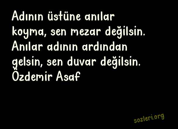 Adının üstüne anılar koyma, sen mezar değilsin. Anılar adının ardından gelsin, sen duvar değilsin. Özdemir Asaf ( Anı )