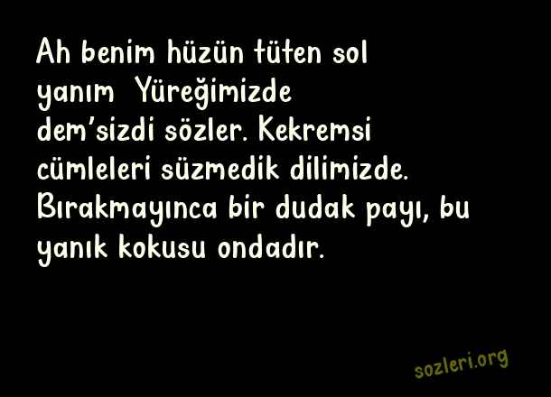 Ah benim hüzün tüten sol yanım… Yüreğimizde dem’sizdi sözler. Kekremsi cümleleri süzmedik dilimizde. Bırakmayınca bir dudak payı, bu yanık kokusu ondadır. ( Sol Yanım )