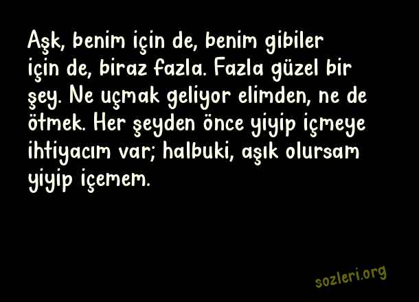 Aşk, benim için de, benim gibiler için de, biraz fazla. Fazla güzel bir şey. Ne uçmak geliyor elimden, ne de ötmek. Her şeyden önce yiyip içmeye ihtiyacım var; halbuki, aşık olursam yiyip içemem. ( Orhan Veli Kanık )