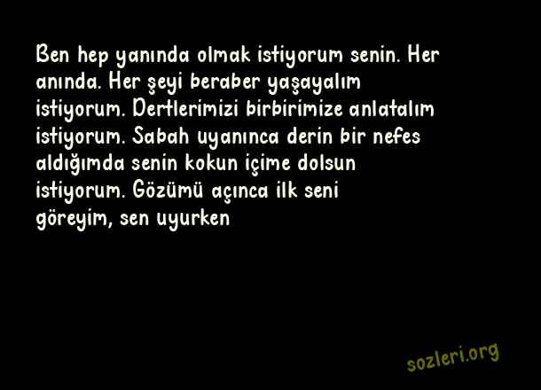 Ben hep yanında olmak istiyorum senin. Her anında. Her şeyi beraber yaşayalım istiyorum. Dertlerimizi birbirimize anlatalım istiyorum. Sabah uyanınca derin bir nefes aldığımda senin kokun içime dolsun istiyorum. Gözümü açınca ilk seni göreyim, sen uyurken ( Yanında Olmak )