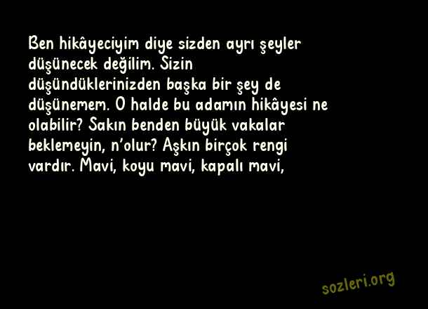 Ben hikâyeciyim diye sizden ayrı şeyler düşünecek değilim. Sizin düşündüklerinizden başka bir şey de düşünemem. O halde bu adamın hikâyesi ne olabilir? Sakın benden büyük vakalar beklemeyin, n’olur? Aşkın birçok rengi vardır. Mavi, koyu mavi, kapalı mavi, ( Sait Faik Abasıyanık )