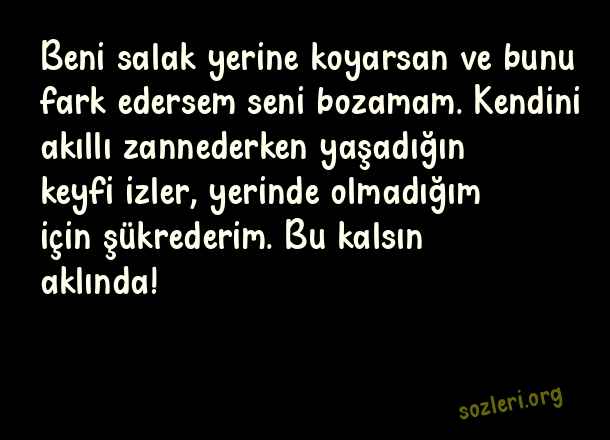 Beni salak yerine koyarsan ve bunu fark edersem seni bozamam. Kendini akıllı zannederken yaşadığın keyfi izler, yerinde olmadığım için şükrederim. Bu kalsın aklında! ( Kendini Uyanık Zannedenlere Sözler )
