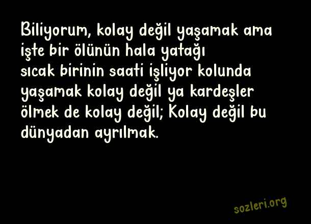 Biliyorum, kolay değil yaşamak ama işte bir ölünün hala yatağı sıcak birinin saati işliyor kolunda yaşamak kolay değil ya kardeşler ölmek de kolay değil; Kolay değil bu dünyadan ayrılmak. ( Orhan Veli Kanık )