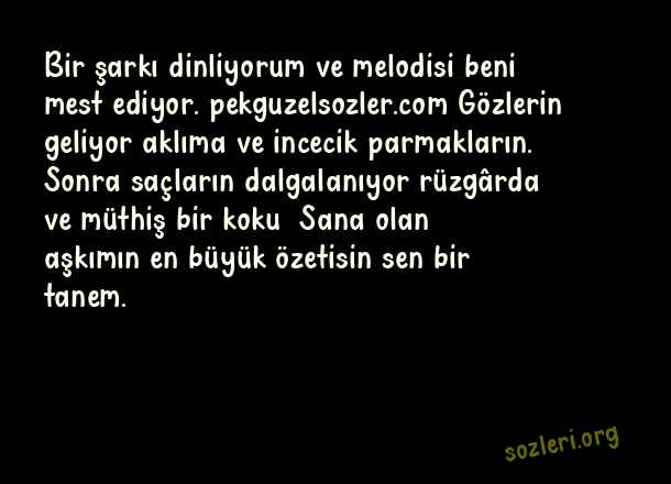 Bir şarkı dinliyorum ve melodisi beni mest ediyor. Gözlerin geliyor aklıma ve incecik parmakların. Sonra saçların dalgalanıyor rüzgârda ve müthiş bir koku… Sana olan aşkımın en büyük özetisin sen bir tanem. ( Dünyanın En Romantik )