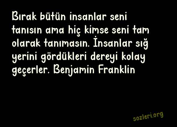 Bırak bütün insanlar seni tanısın ama hiç kimse seni tam olarak tanımasın. İnsanlar sığ yerini gördükleri dereyi kolay geçerler. Benjamin Franklin ( Tanımak )