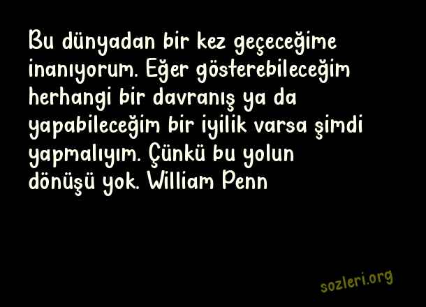 Bu dünyadan bir kez geçeceğime inanıyorum. Eğer gösterebileceğim herhangi bir davranış ya da yapabileceğim bir iyilik varsa şimdi yapmalıyım. Çünkü bu yolun dönüşü yok. William Penn ( Anı Yaşamak )