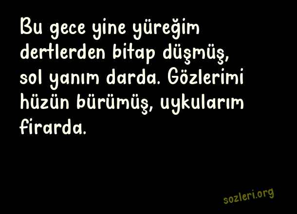 Bu gece yine yüreğim dertlerden bitap düşmüş, sol yanım darda. Gözlerimi hüzün bürümüş, uykularım firarda. ( Sol Yanım )