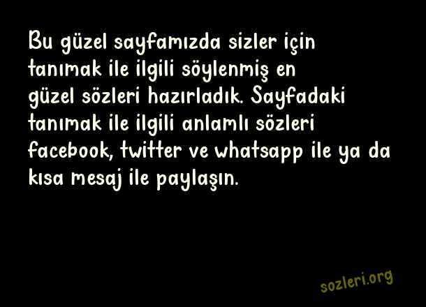 Bu güzel sayfamızda sizler için tanımak ile ilgili söylenmiş en güzel sözleri hazırladık. Sayfadaki tanımak ile ilgili anlamlı sözleri facebook, twitter ve whatsapp ile ya da kısa mesaj ile paylaşın. ( Tanımak )