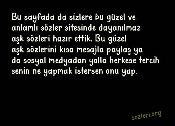 Bu sayfada da sizlere bu güzel ve anlamlı sözler sitesinde dayanılmaz aşk sözleri hazır ettik. Bu güzel aşk sözlerini kısa mesajla paylaş ya da sosyal medyadan yolla herkese tercih senin ne yapmak istersen onu yap. ( Dayanılmaz Aşk )