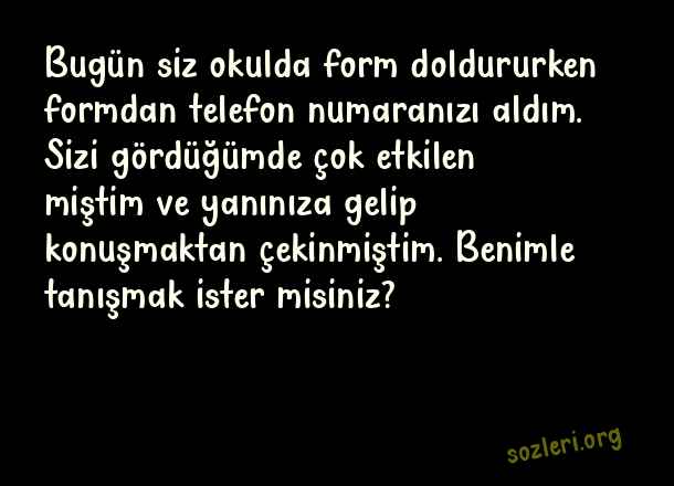Bugün siz okulda form doldururken formdan telefon numaranızı aldım. Sizi gördüğümde çok etkilen miştim ve yanınıza gelip konuşmaktan çekinmiştim. Benimle tanışmak ister misiniz? ( Tanışma )