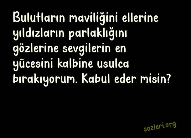 Bulutların maviliğini ellerine yıldızların parlaklığını gözlerine sevgilerin en yücesini kalbine usulca bırakıyorum. Kabul eder misin? ( Tanışma )